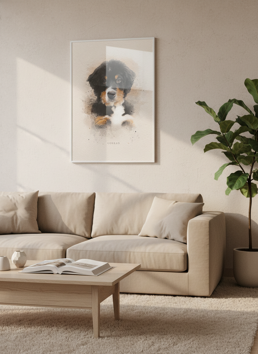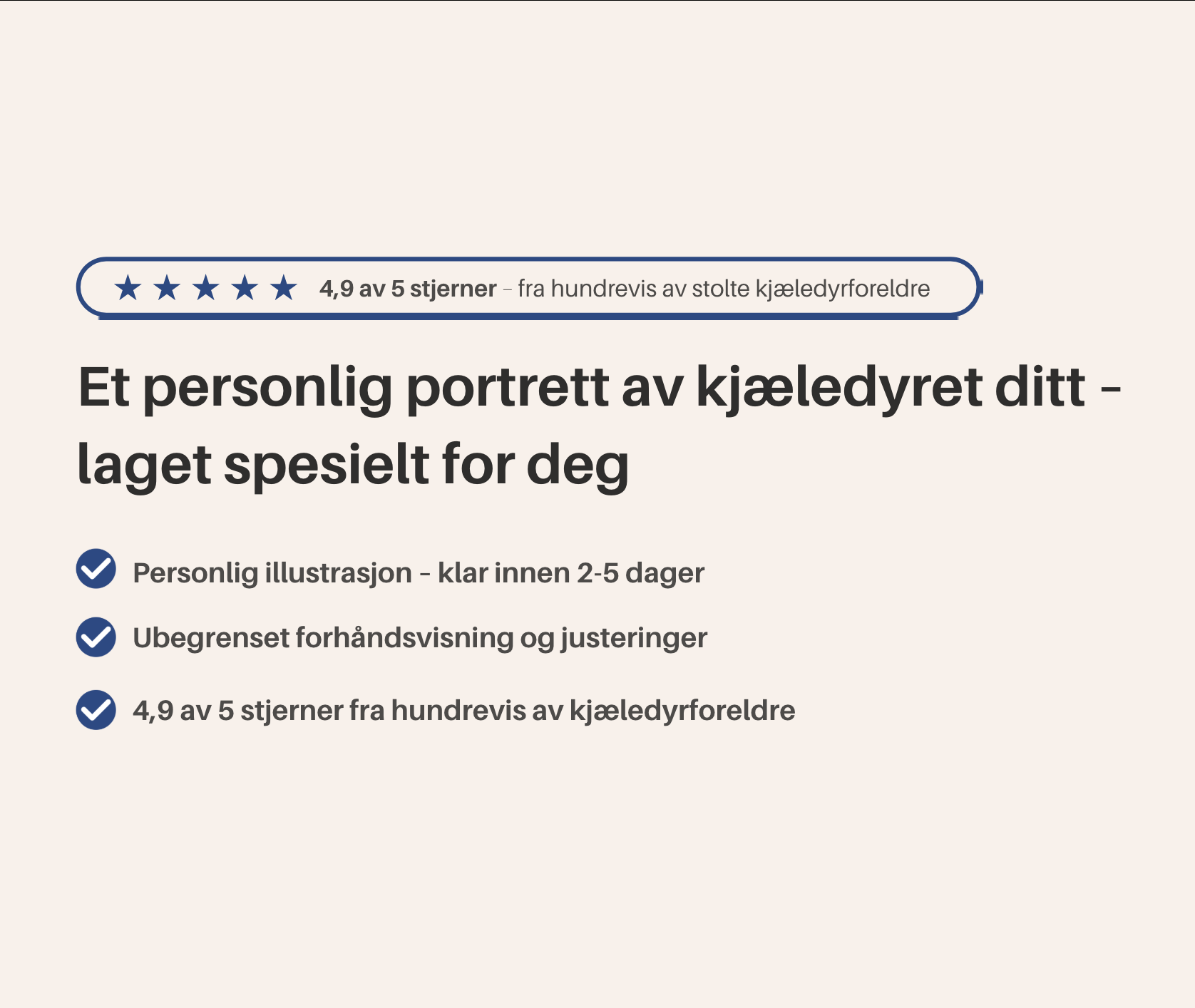 Når du handler hos oss, får du kvalitet og profesjonell produksjon. Hver plakat er et unikt kunstverk gjennom digital tegning, grafiske illustrasjoner eller AI. Et personlig og tidløst minne om ditt kjæledyr. Ingenting trykkes før du godkjenner bilde.