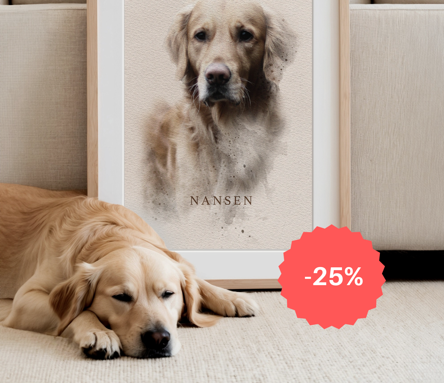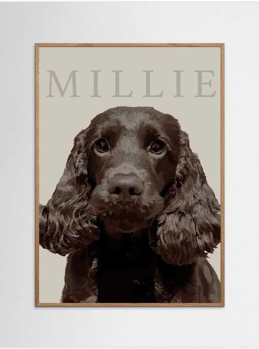 Med våre personlige kjæledyrplakater feirer vi båndet mellom deg og din firbente venn. Samtidig gir vi tilbake: 10 % av alle salg går til Spaniahundene, en organisasjon som redder og omplasserer hunder som Oly.